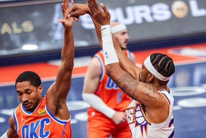 防不住的同时,太阳自己进攻也毫无章法,只能让狄龙零敲碎打,虽然他本赛季场均拿下22分,但是在面对雷霆队顶级外线防守人华莱士和维金斯时,狄龙腹背受敌,打得非常挣扎。全场比赛,狄龙16投4中,拿下16分,效率惨不忍睹。而他这个16分,还是太阳全队最高得分了,其他四个首发球员,没有一个人得分上双,当3D球员狄龙成为主攻点时,你就知道这支球队的进攻有多糟糕了。太阳今天唯一的遮羞布,是昔日湖人队的边缘人物古德温,他替补出场12投6中,拿下了全队第二高的15分,是全场唯一想拼到最后一刻的太阳球员。