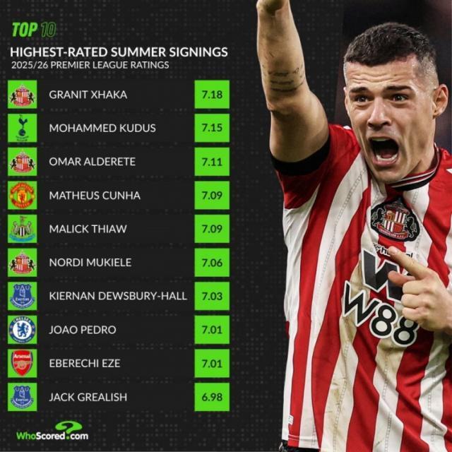 whoscored英超新援评分榜:扎卡居首,库尼亚、佩德罗、埃泽在列